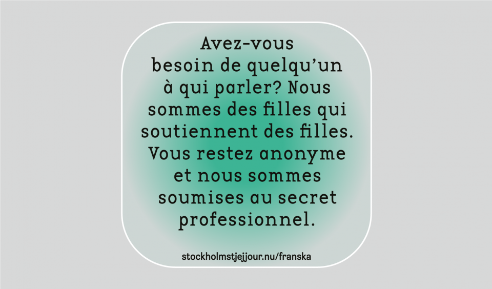 Stockholms tjejjour est une organisation d’entraide féminine qui propose des entretiens de soutien par chat, e-mail, téléphone ou rencontre. Nous existons depuis 1996 et nous sommes la première ligne d’écoute pour filles en Suède. Nous avons de ce fait une longue expérience du soutien aux filles, et on le fait à vos conditions. Cela signifie entre autres que vous pouvez toujours rester anonyme et que nous sommes soumises au secret professionnel. Nous qui travaillons comme filles de soutien, nous travaillons bénévolement et nous ne sommes ni psychologues ni employées publiques, nous sommes là pour vous en tant qu’aide humaine.